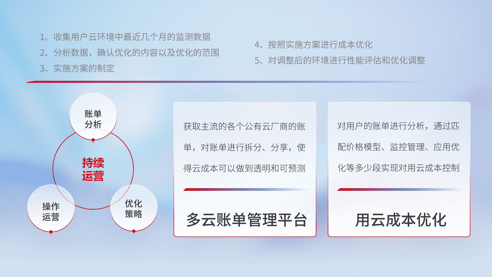 通过多云纳管,,,,以统一的资源数据模型把客户的云资源进行抽象和封装,,,,进而实现对多云资源的统一操作,,保障云资源管理的可靠性、、、、稳定性与可用性。。。。量身定制化运维内容,,配置、、开发运维、、补丁管理、、、、备份、、、监控、、、认证和访问管理、、、审计和日常巡检等,,保障在用云过程中的可靠度,,,,稳定度以及高可用率。。